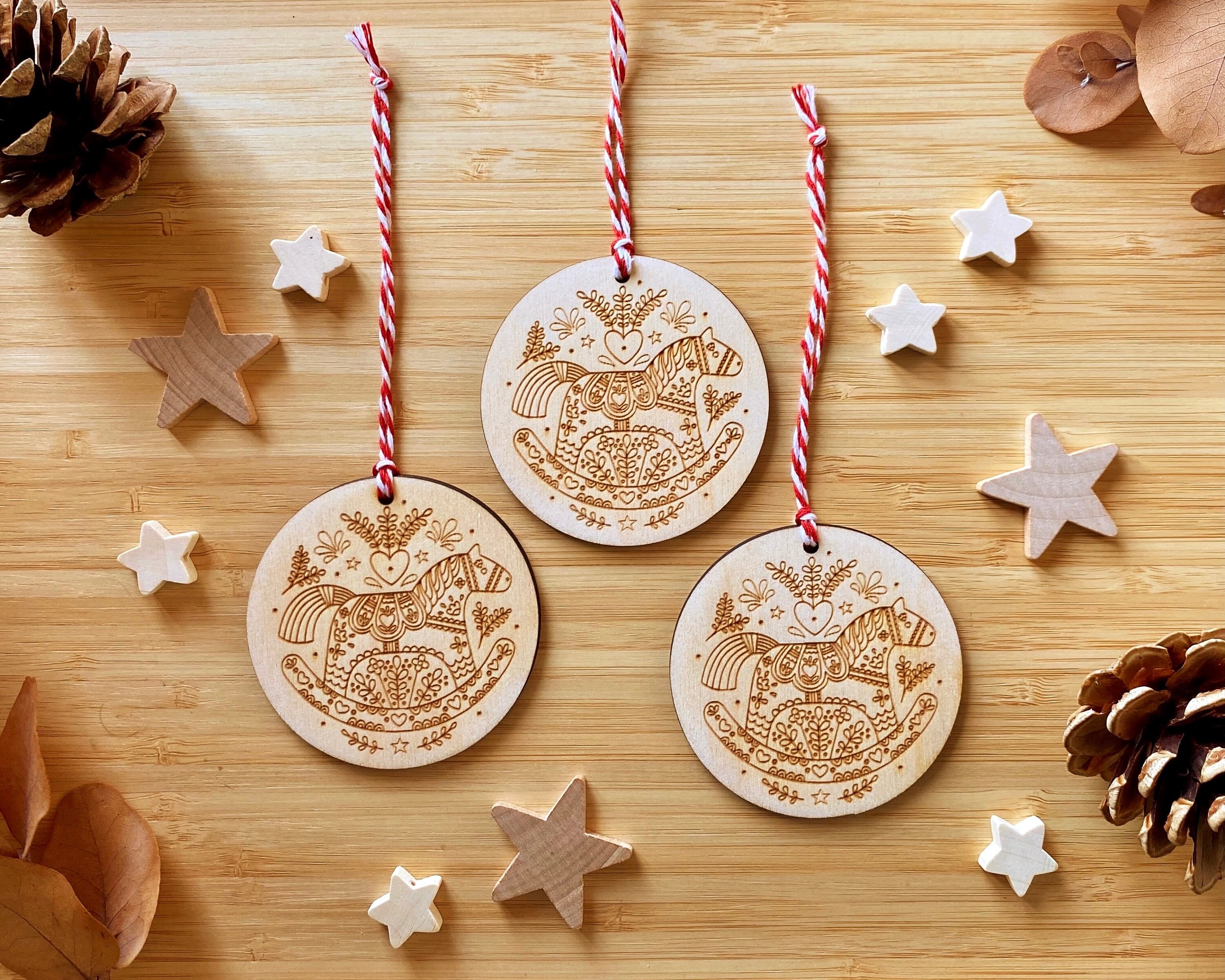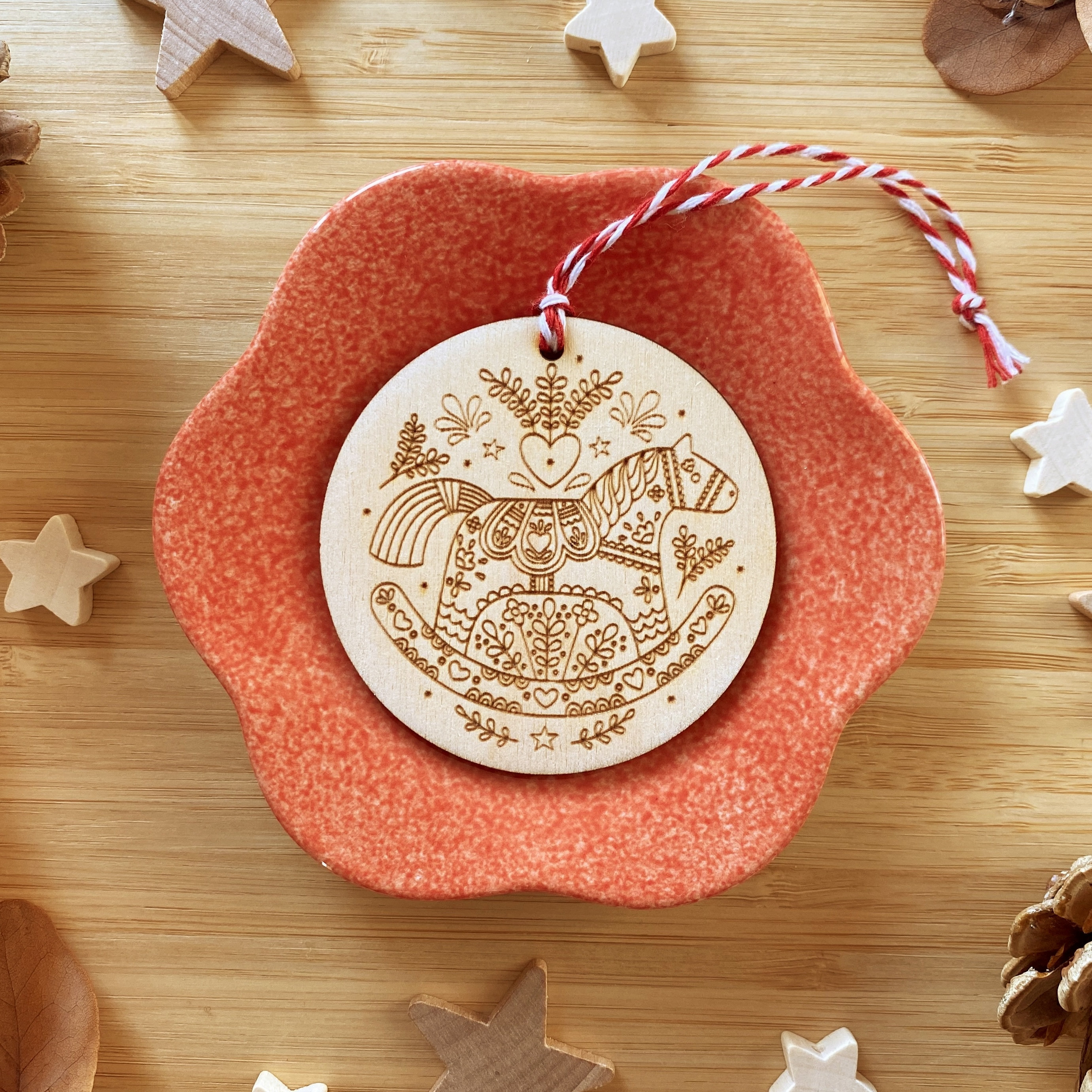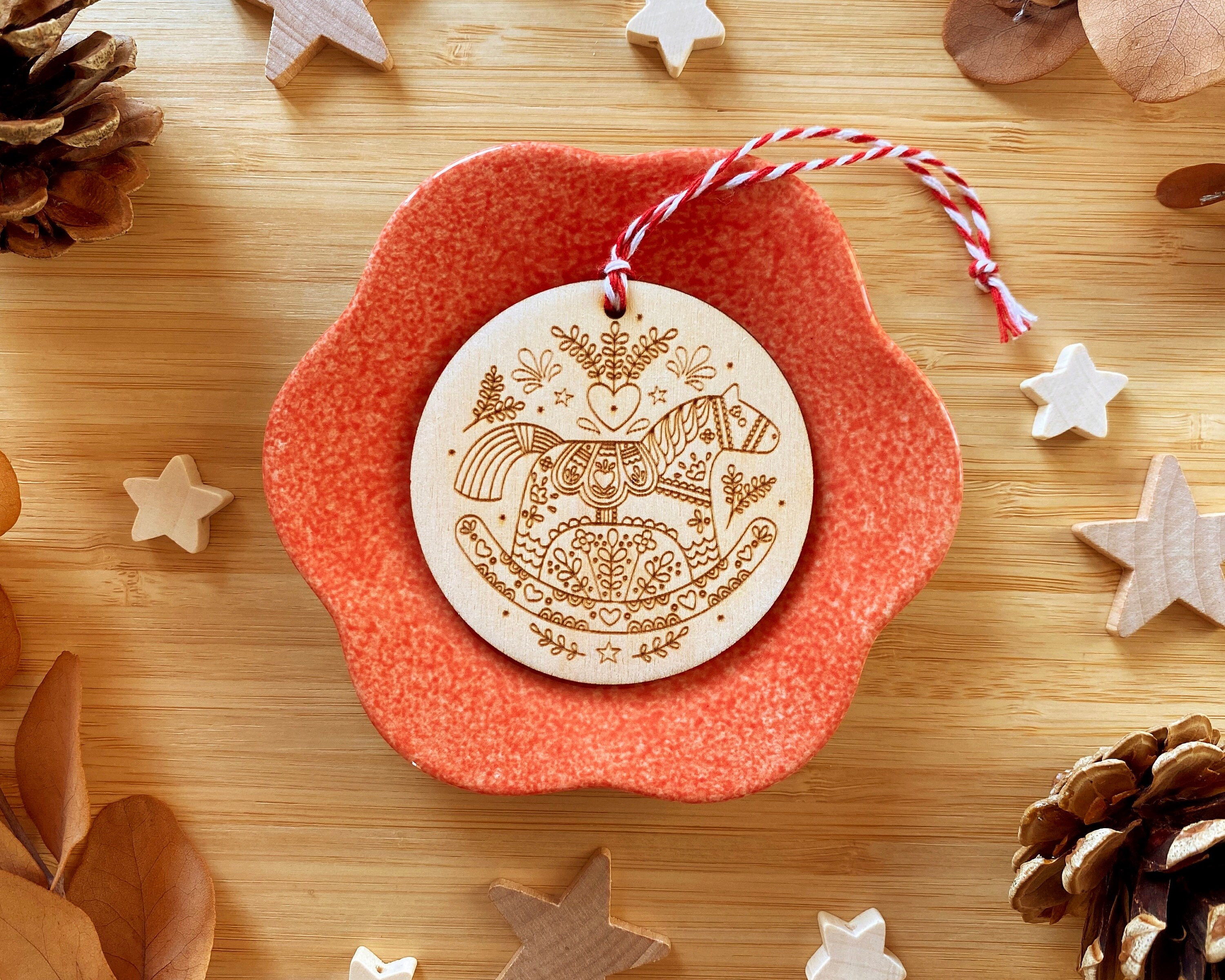 A Scandi inspired Dala rocking horse ornament to adorn your Christmas tree, pop into a stocking, gift a loved one or add to a greeting card.