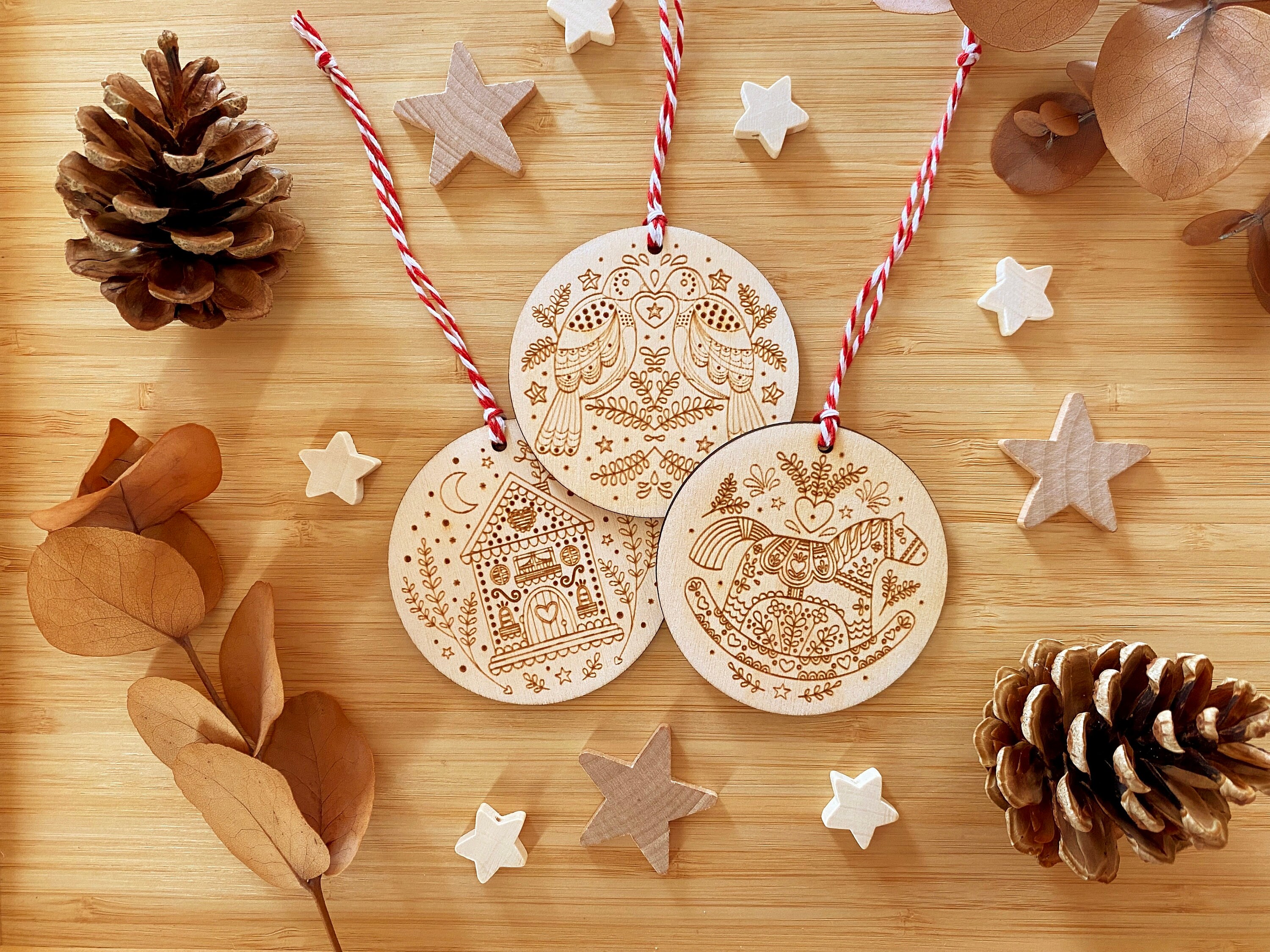 Designed by me in my Dublin Studio and laser cut and engraved by Paper Tree in Donegal, these ornaments measure 75mm in diameter and 3mm in depth. They are threaded with red and white cotton baker’s twine.