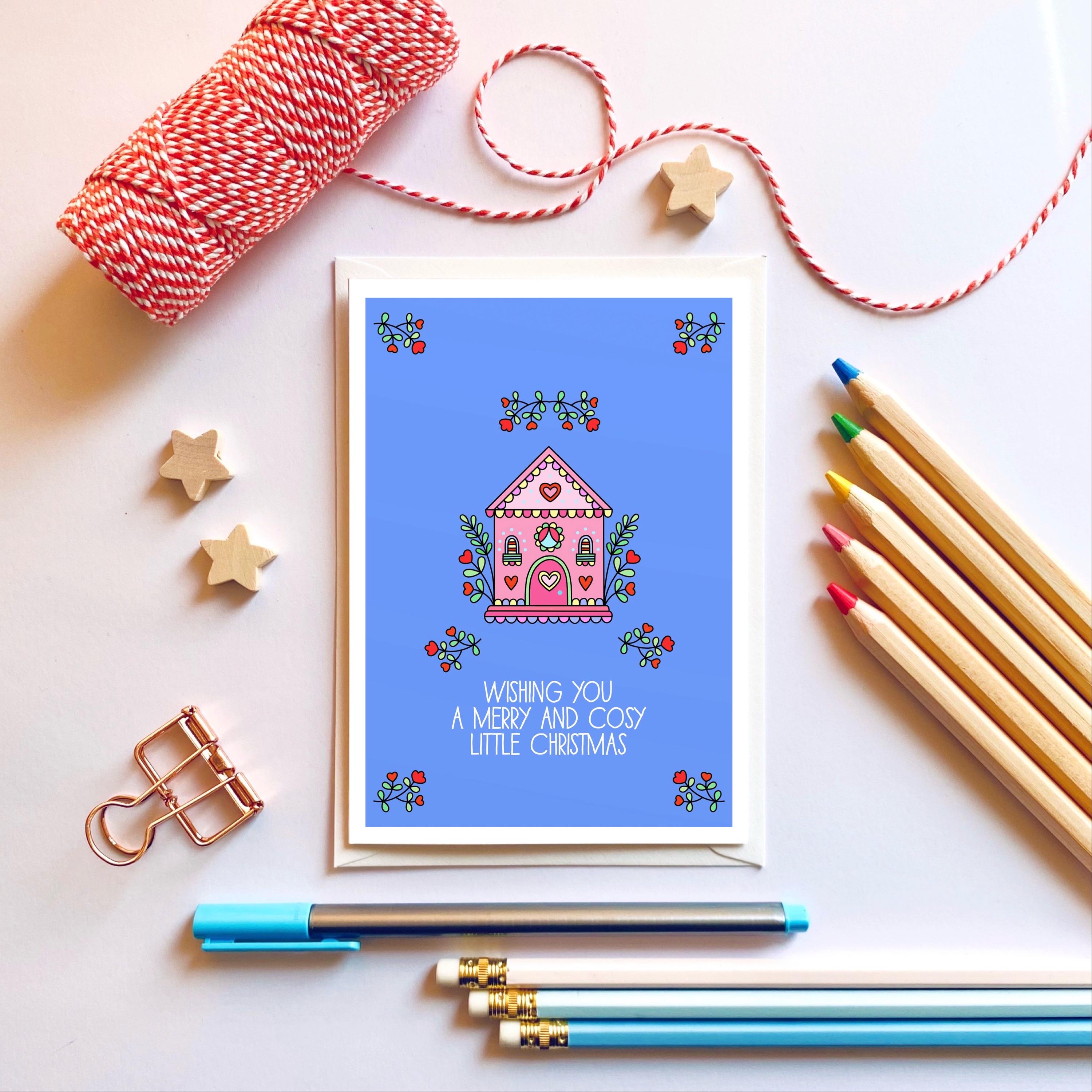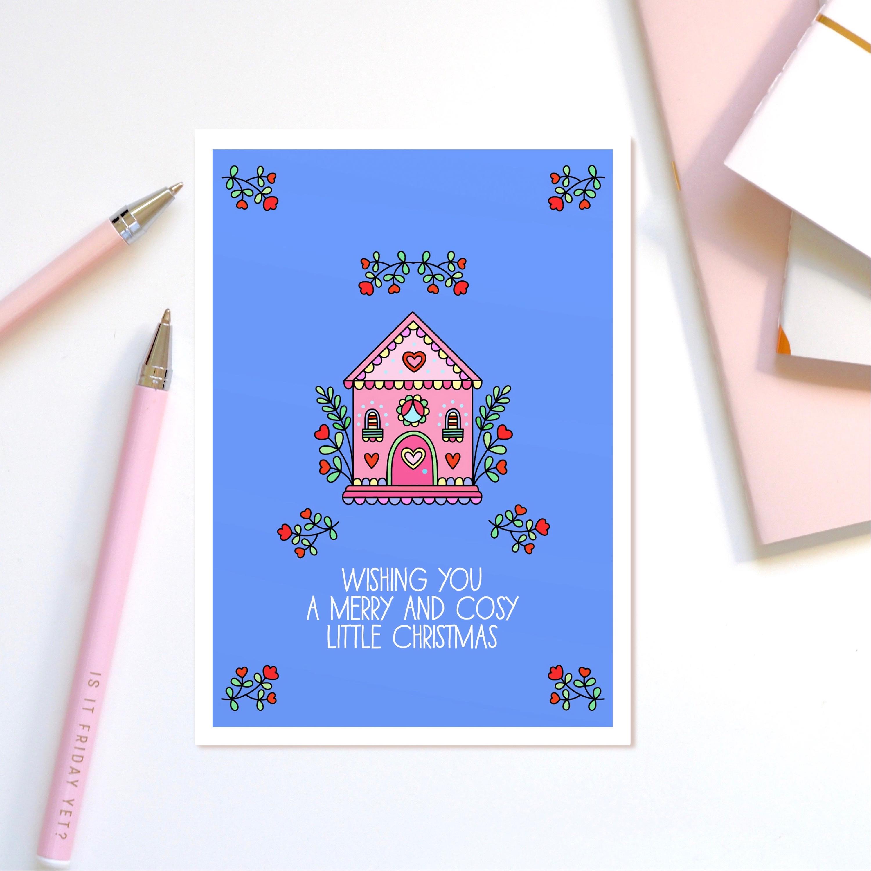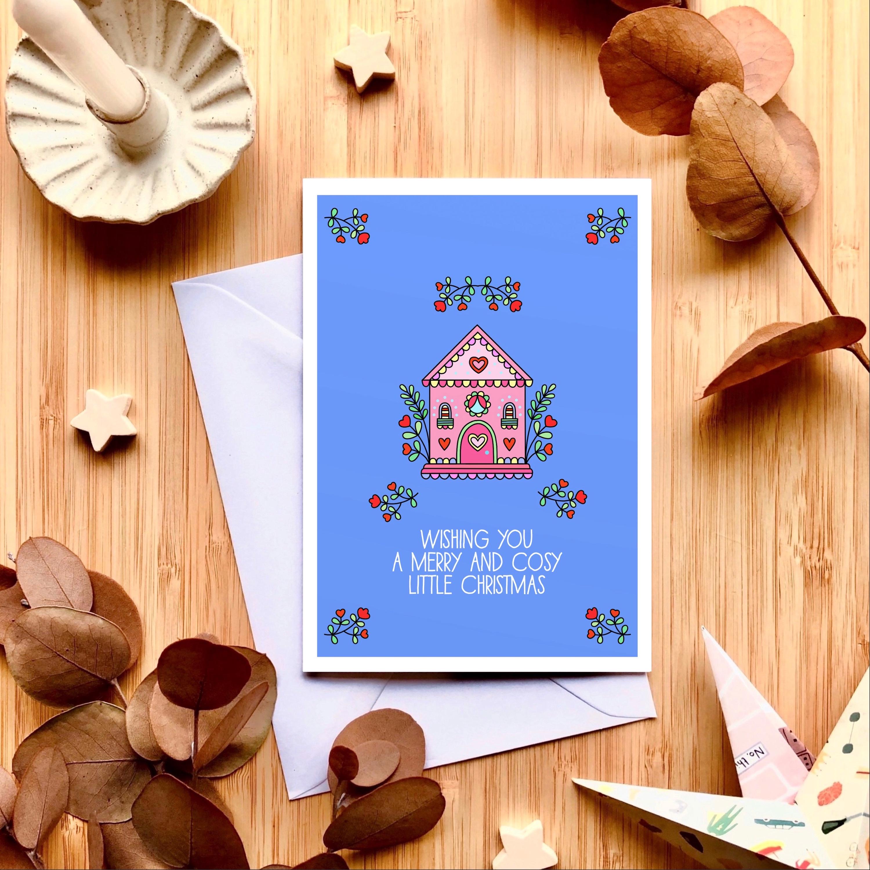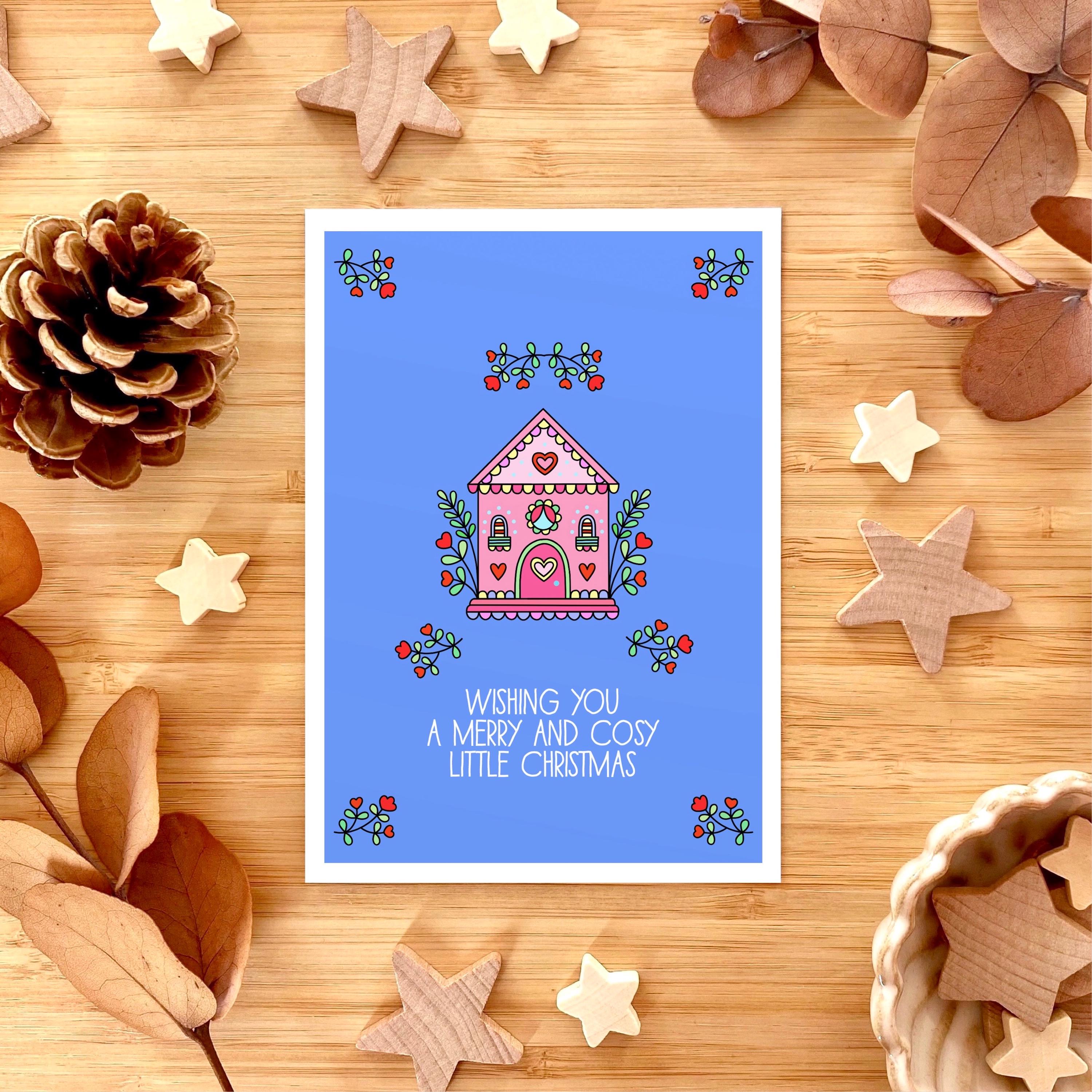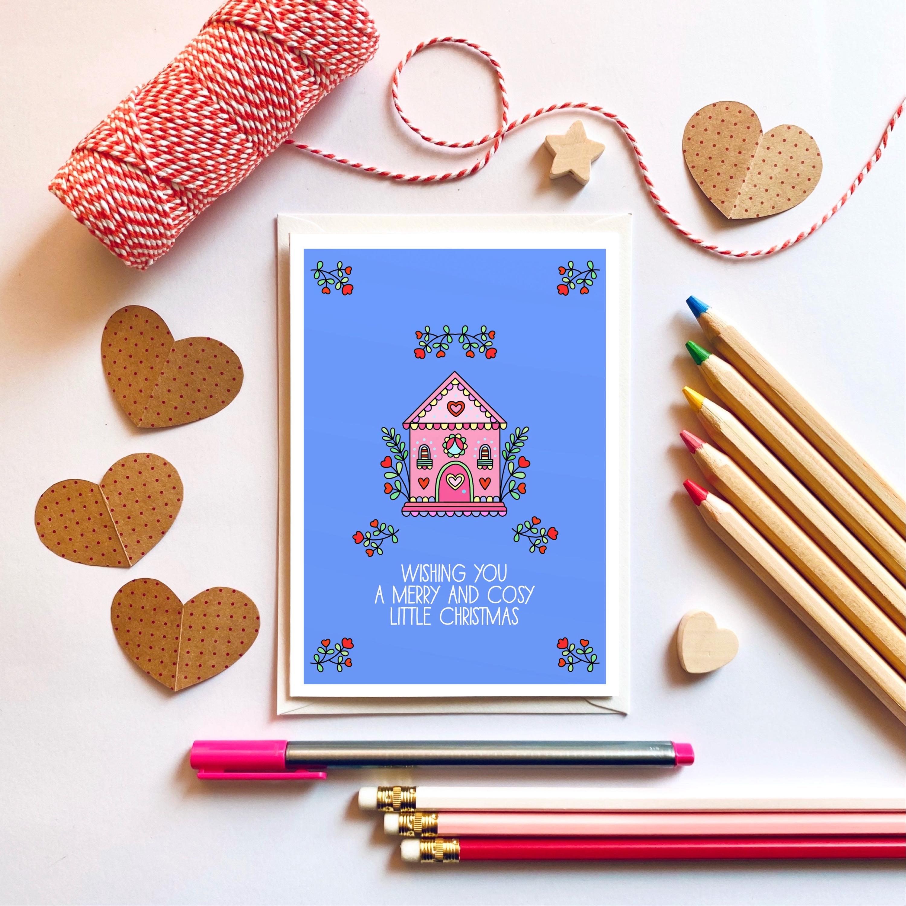 Wishing you a merry and cosy little Christmas. Cute winter cottage Christmas card.