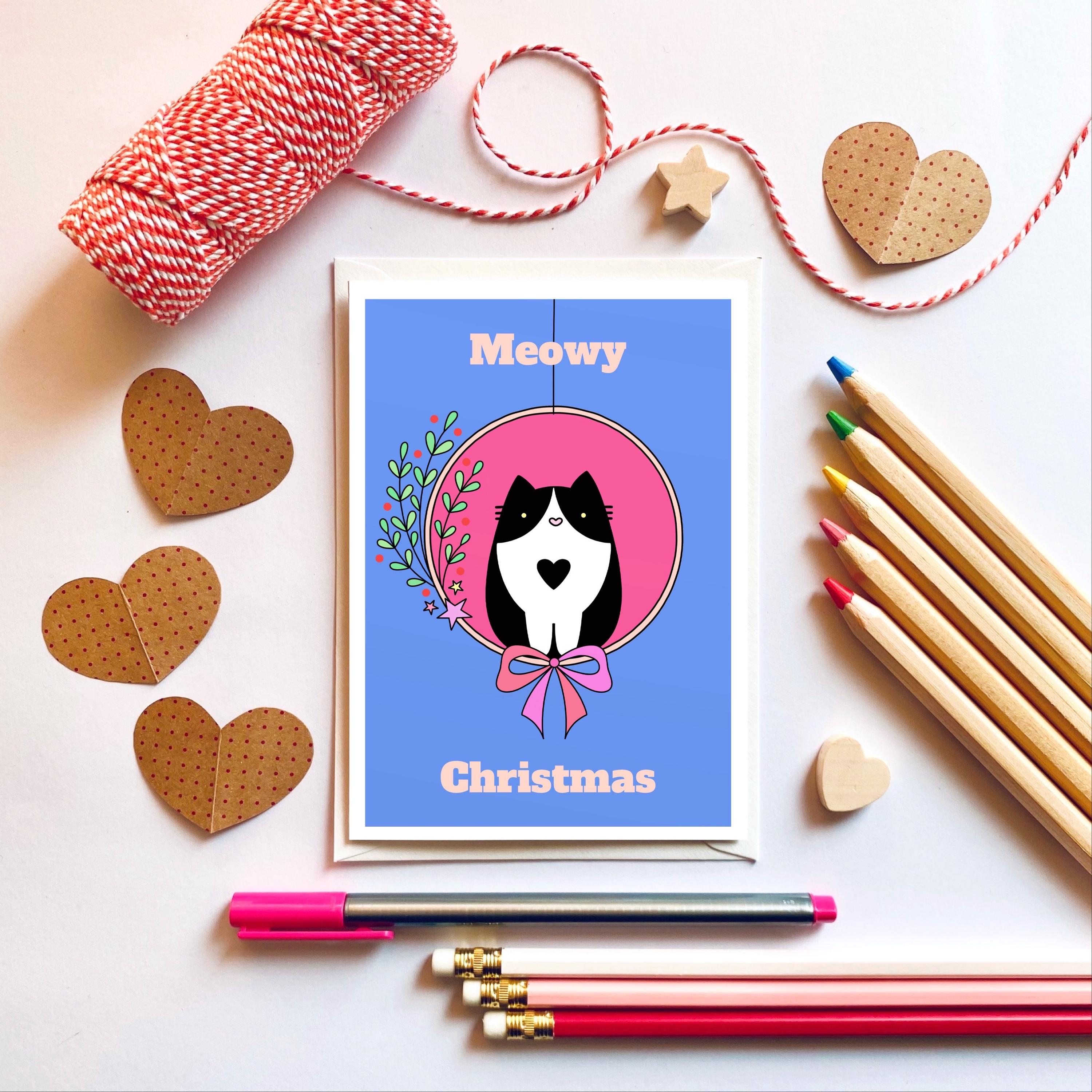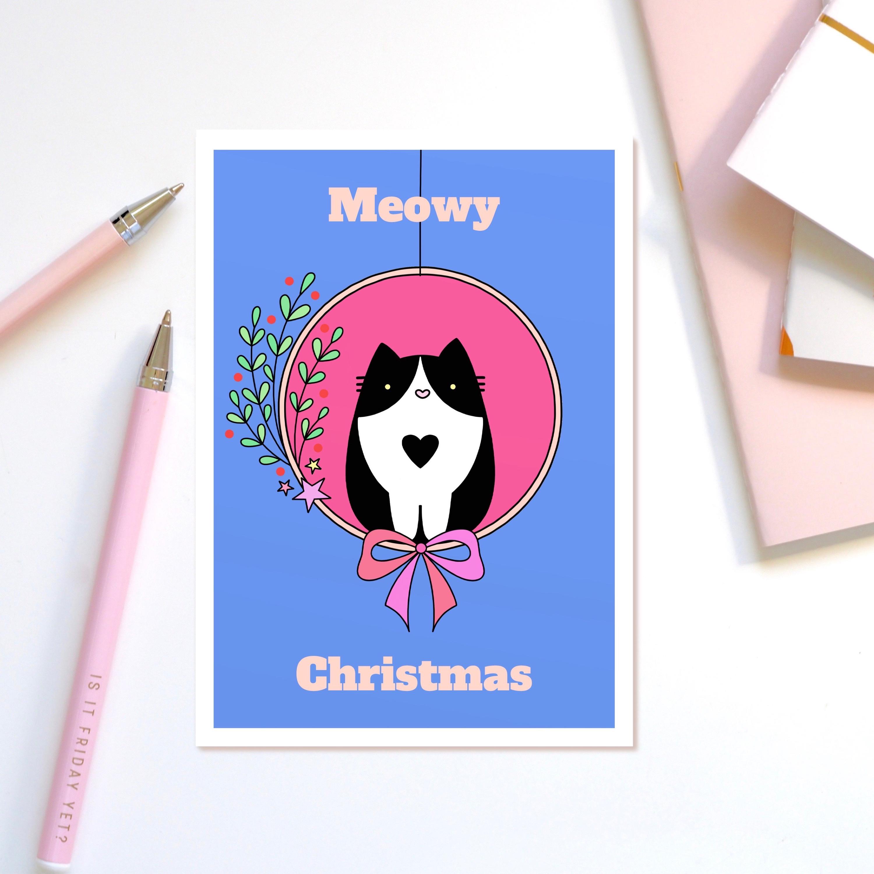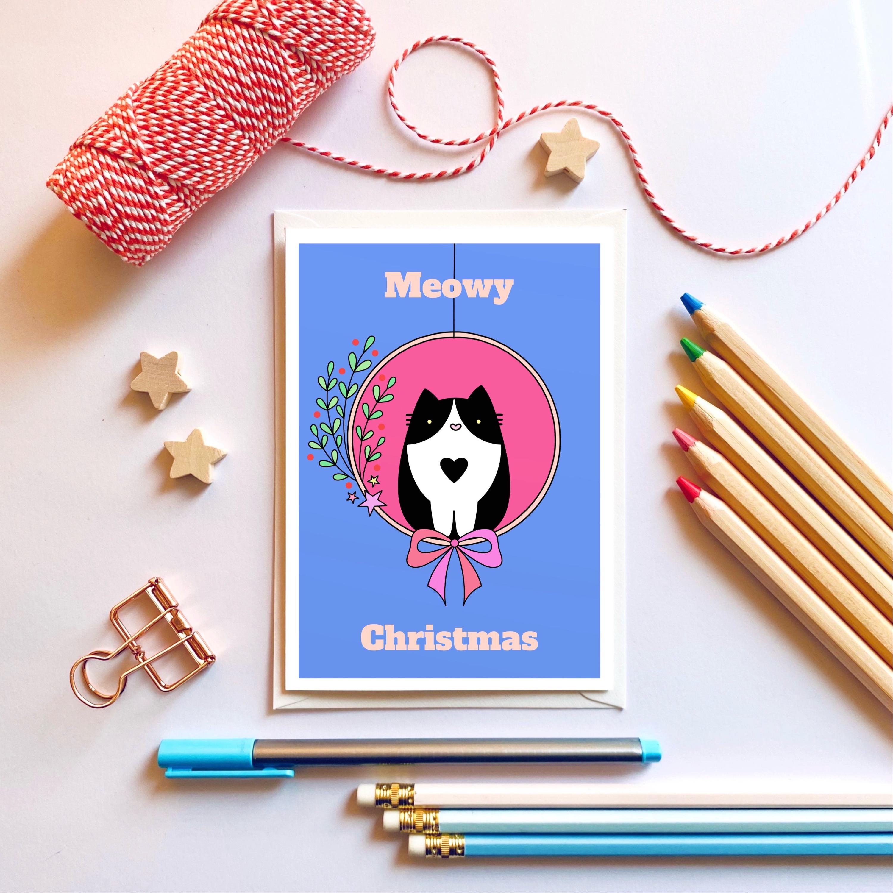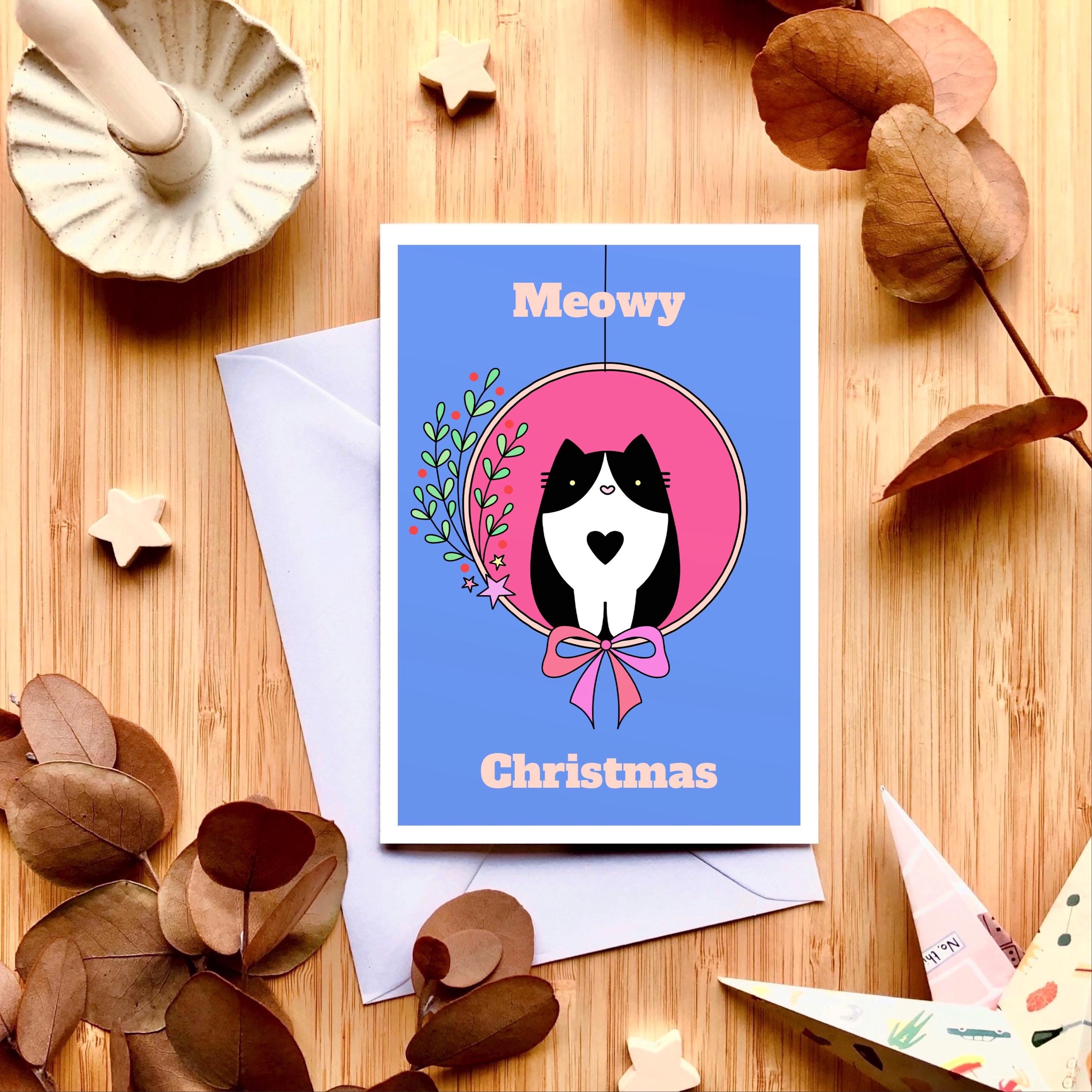 Meowy Christmas. Cute cat in a wreath Christmas card.