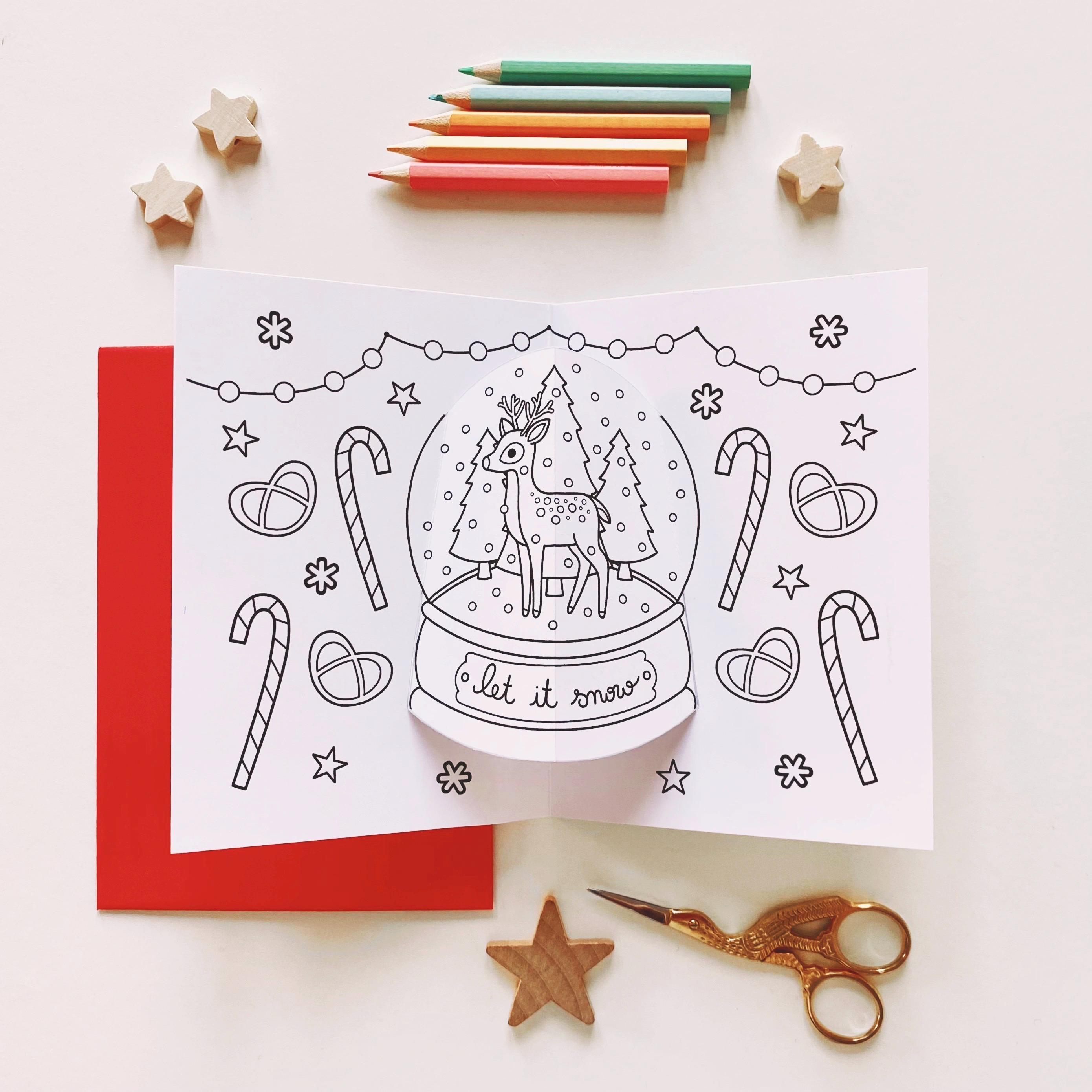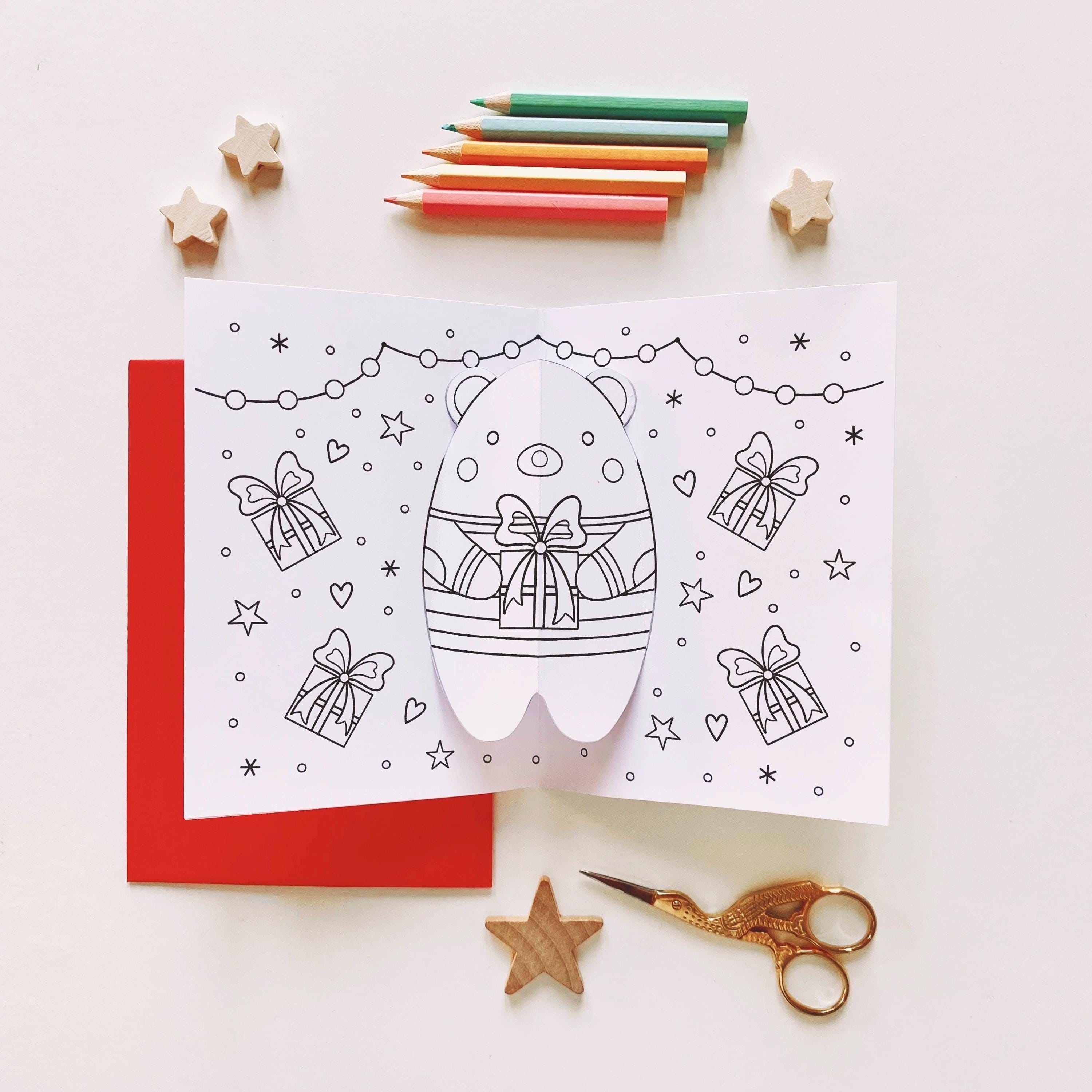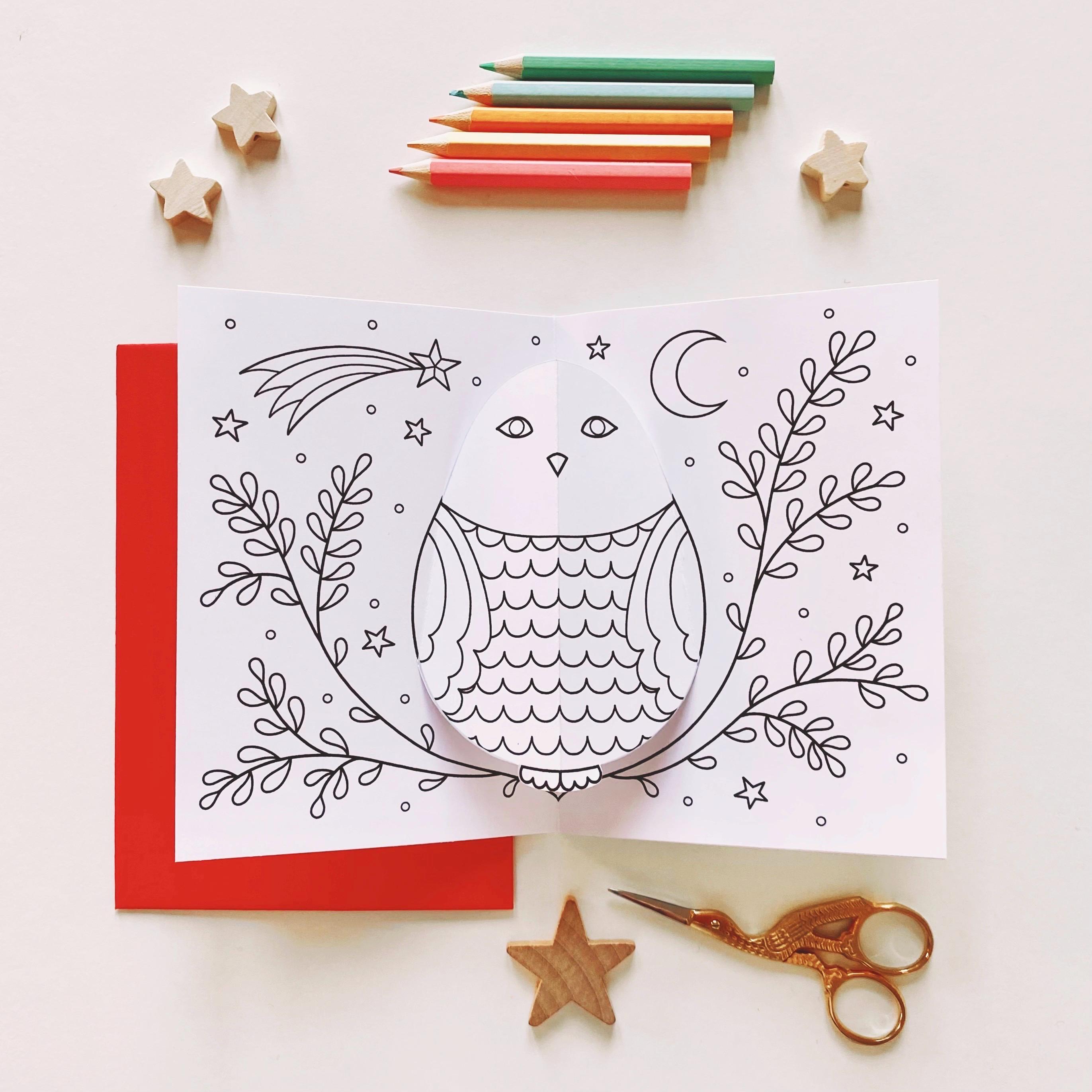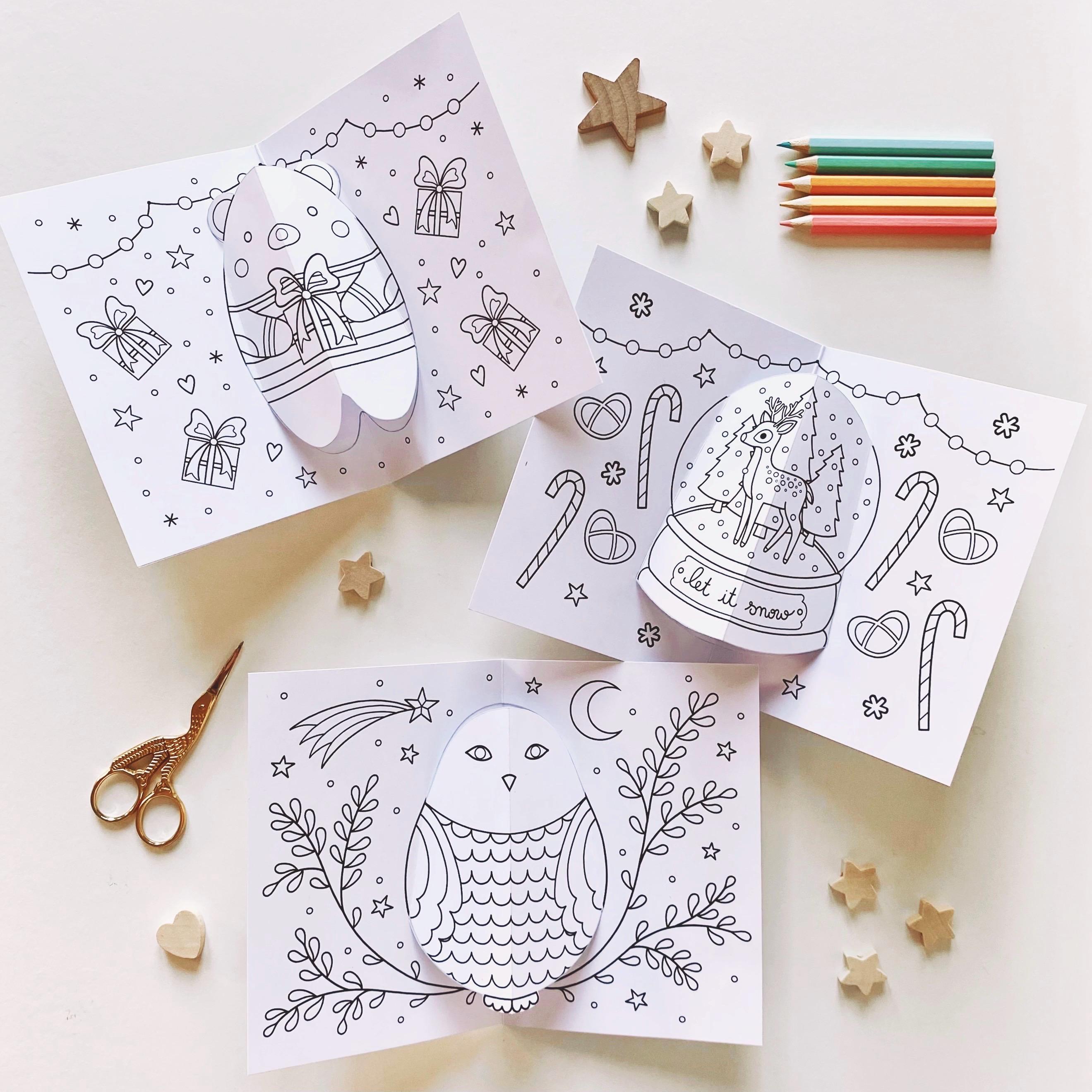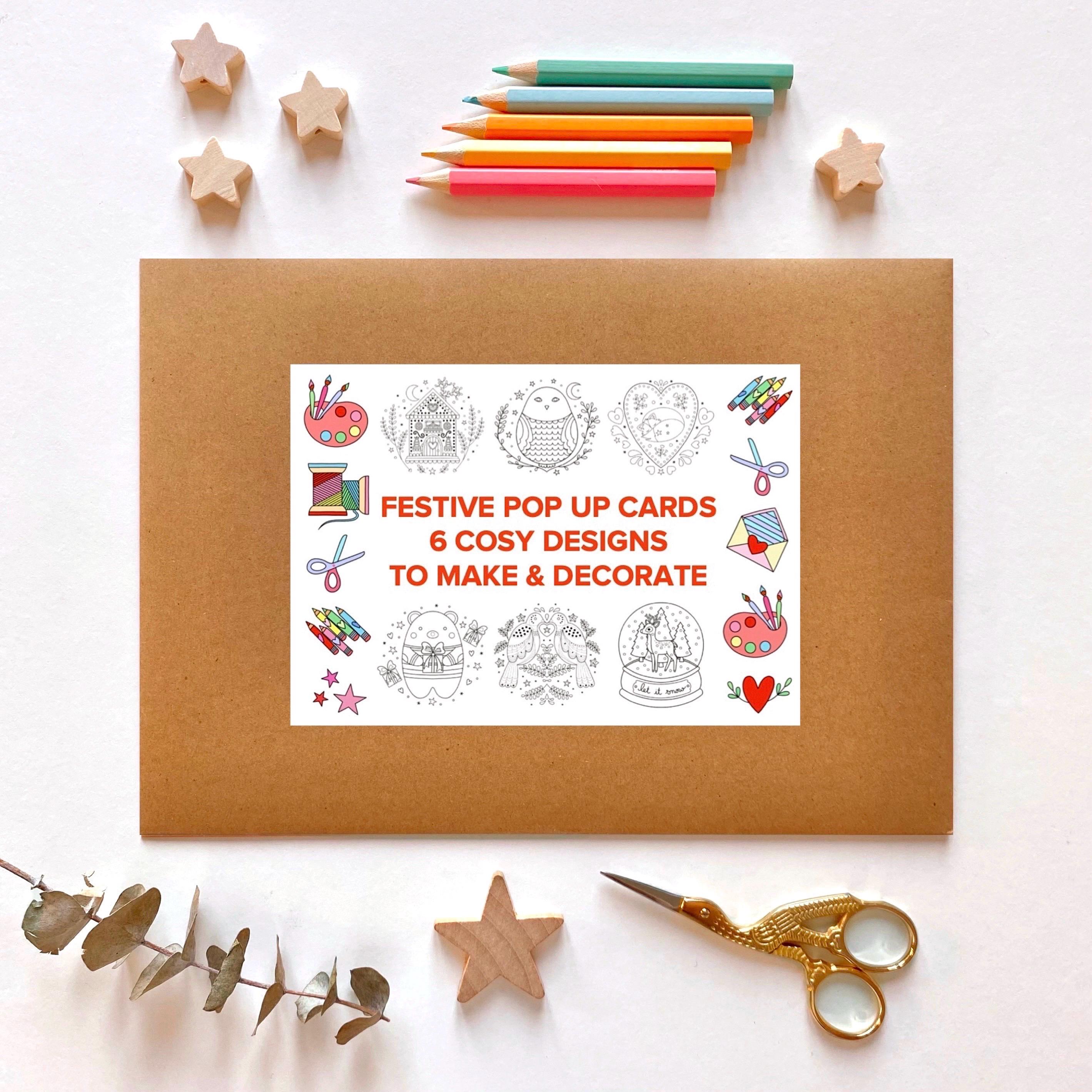 Colour in and make your own set of 6 festive pop up cards, with 6 different designs: a pair of sweet love birds, a cute sleeping fox, a cosy winter cottage, a bear with wrapped gifts, a snow owl and a snow globe with deer.