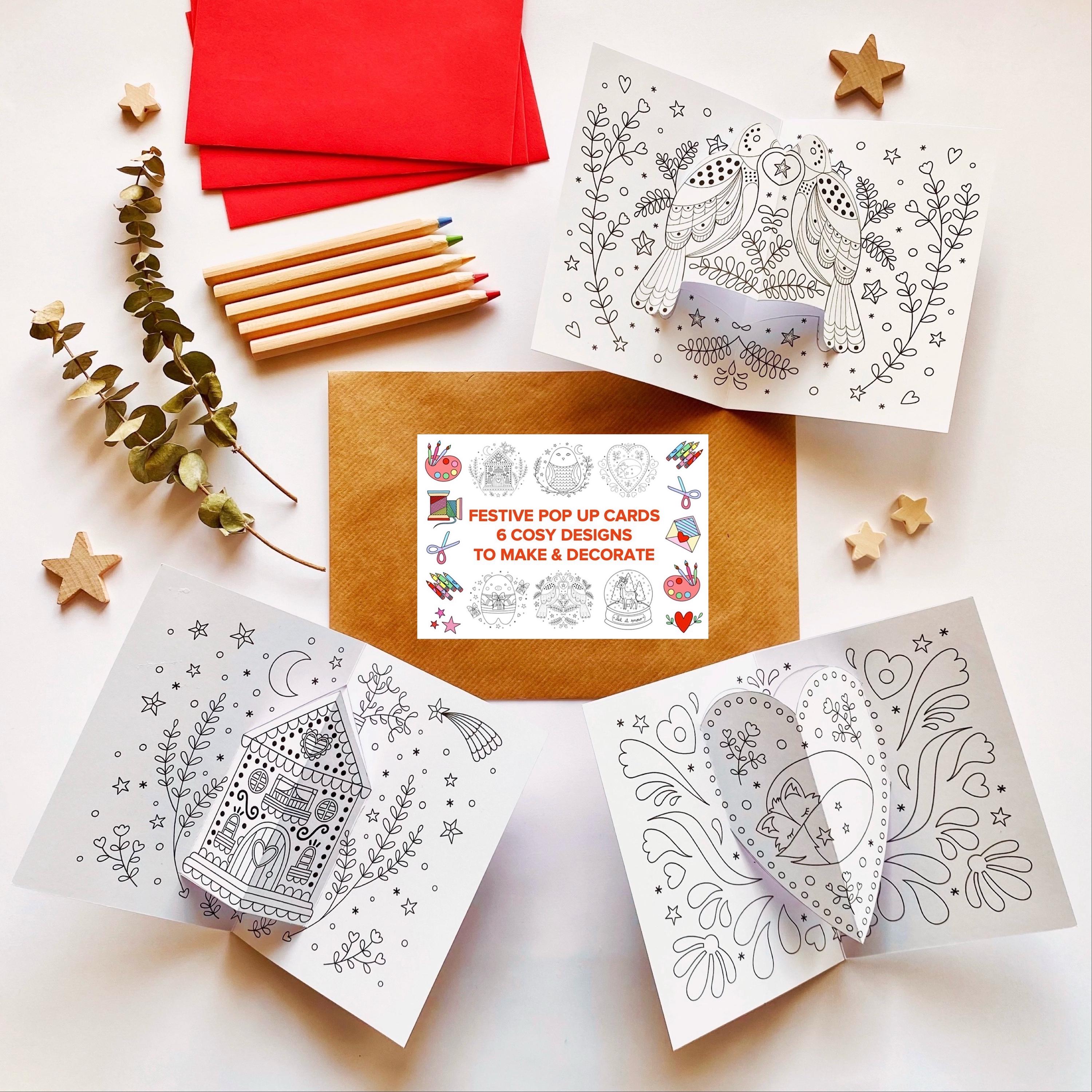 6 easy to make colouring pop up cards printed on recycled white card, measuring 14.8cm x 21cm when open (10.5 x 14.8cms when folded),