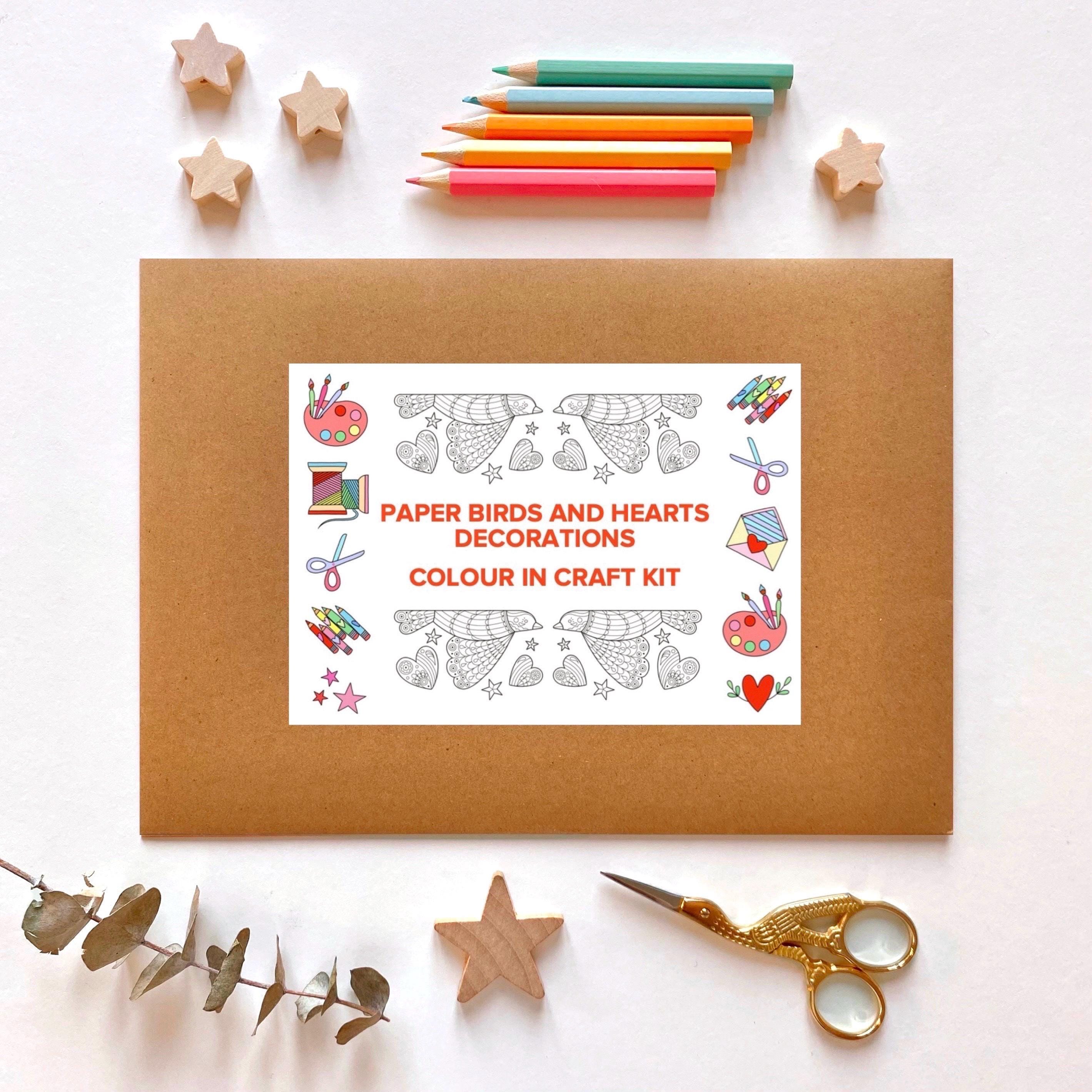 Colour in, cut out, fold and glue paper birds and hearts into whimsical and festive ornaments, cute bunting or a pretty hanging garland.