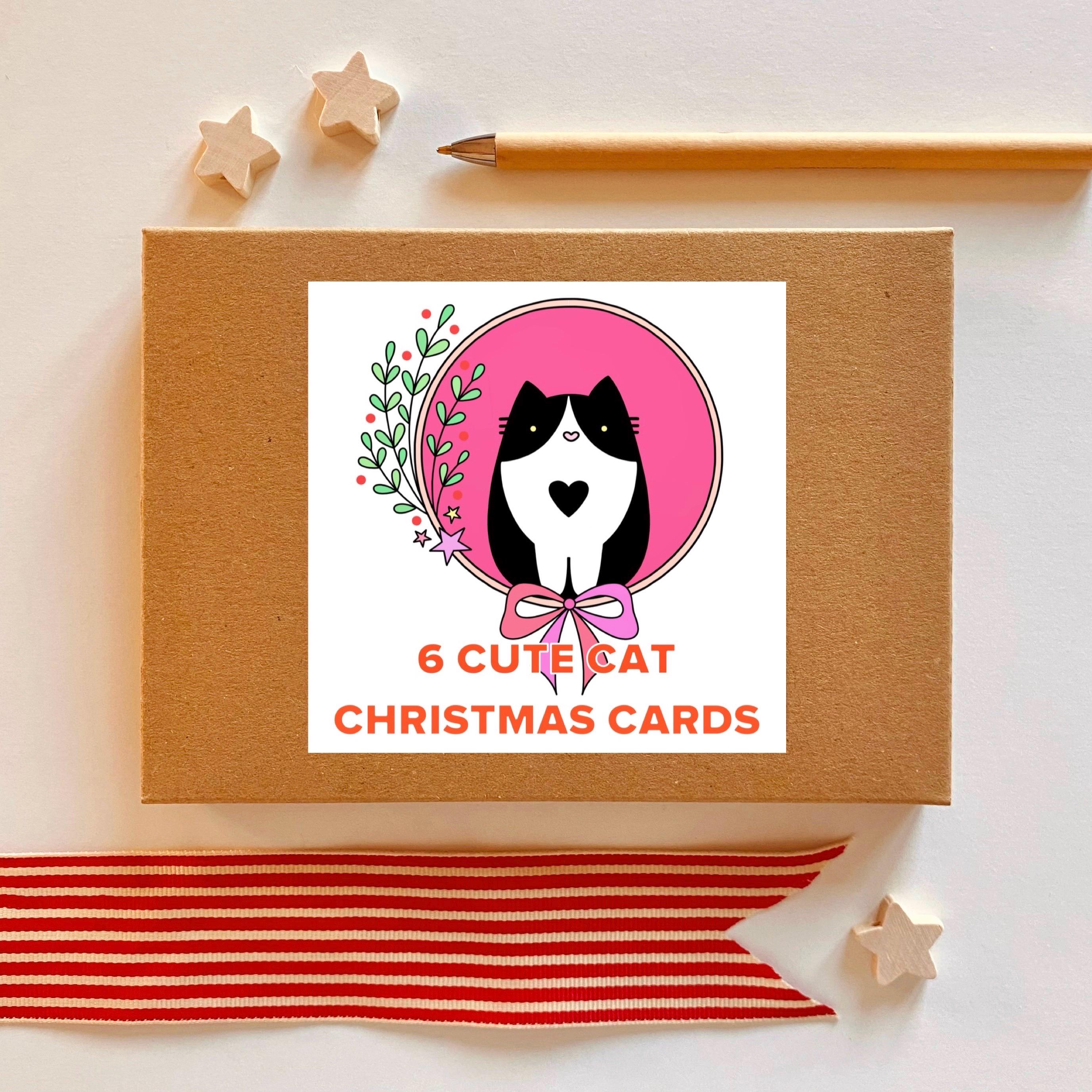 A pack of 6 Christmas cards with 6 envelopes. These cards feature 3 cute and Christmassy cat designs: a black and white cat sitting in a wreath, a grey and white cat playing in a gift box and a calico cat snuggled up in a stocking.