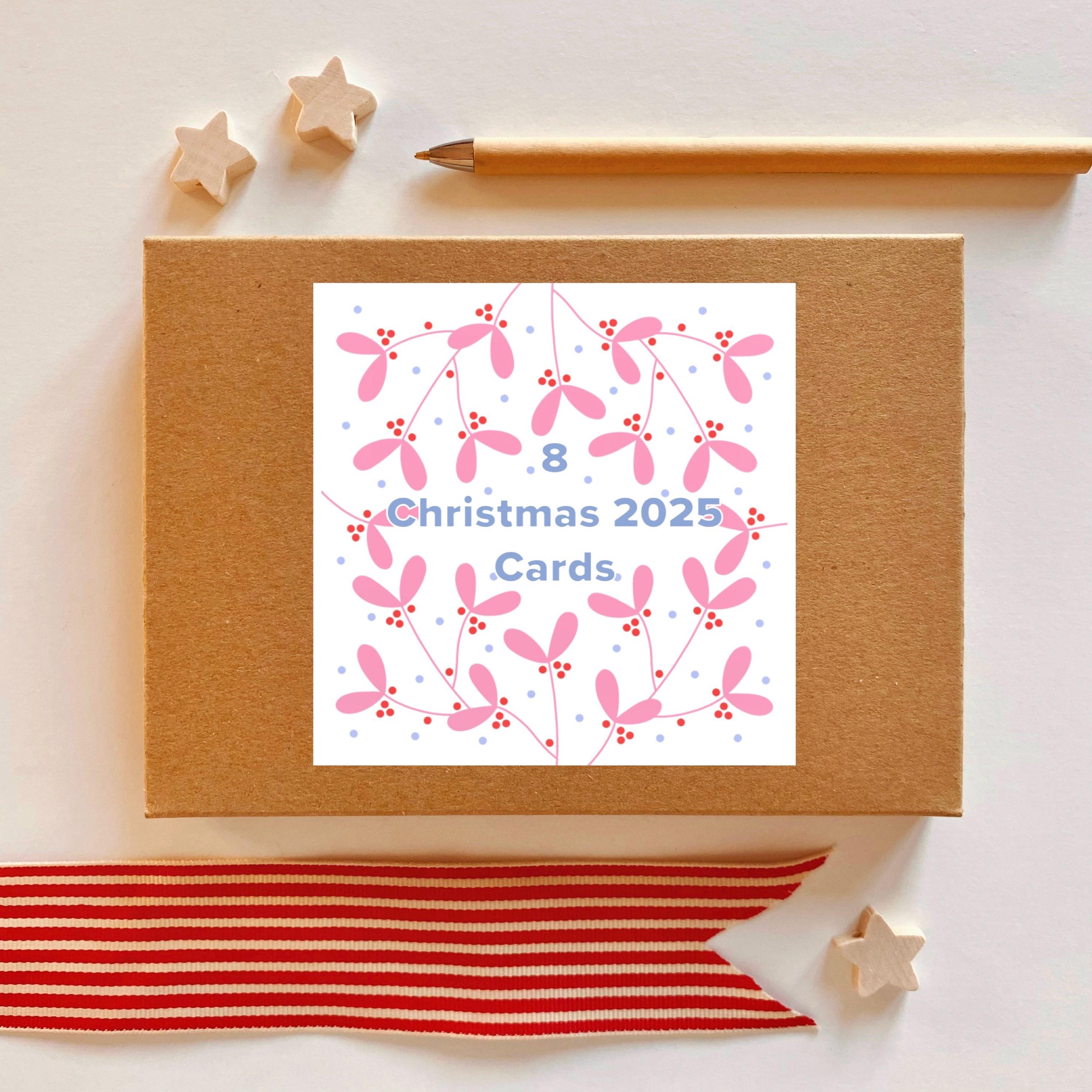A pack of 8 Christmas cards with 8 envelopes. These cards feature all my new 2025 designs with cute cats, dachshunds in jumpers, a snow globe with adorable deer, a scandi inspired heart ornament, a cosy cottage and a peace dove.