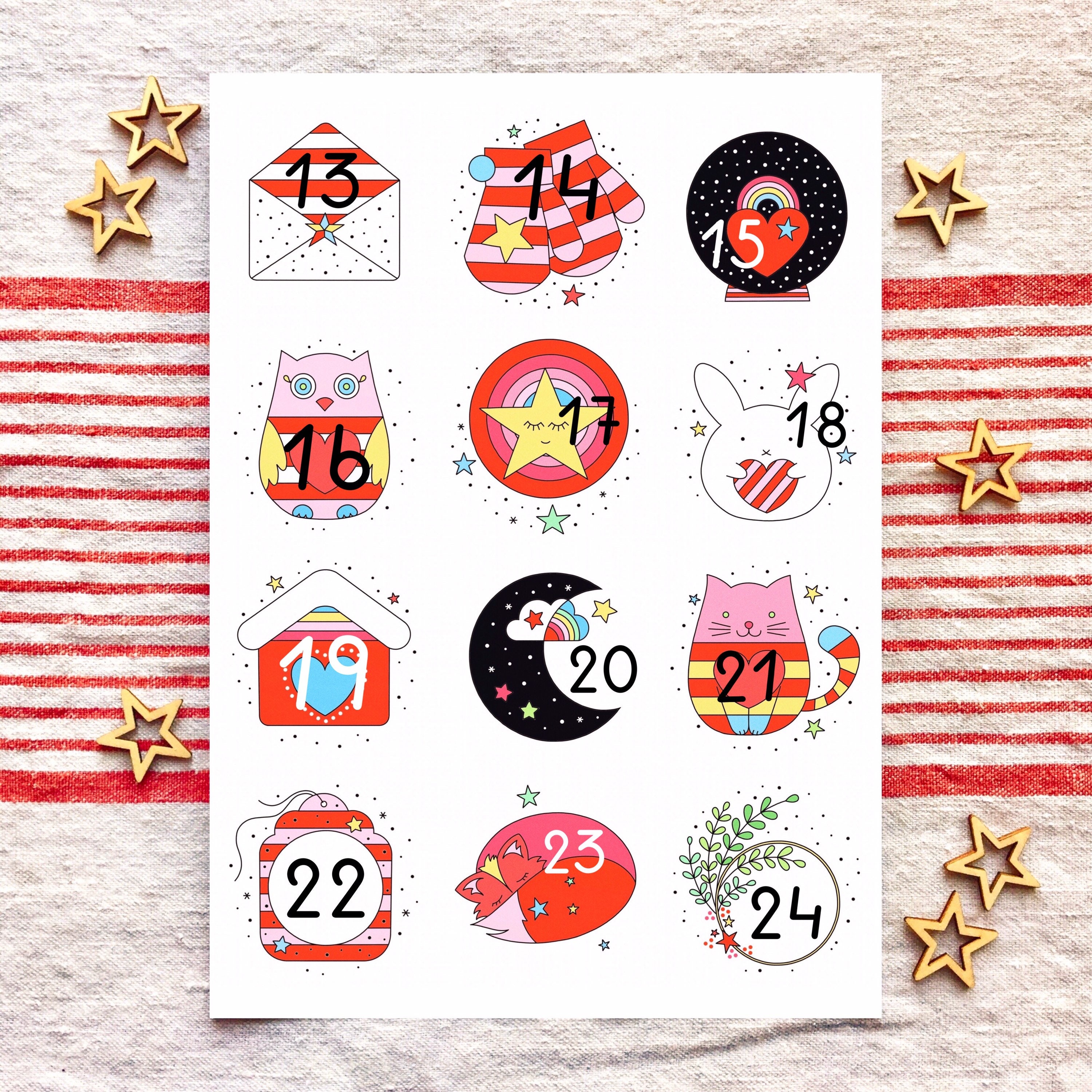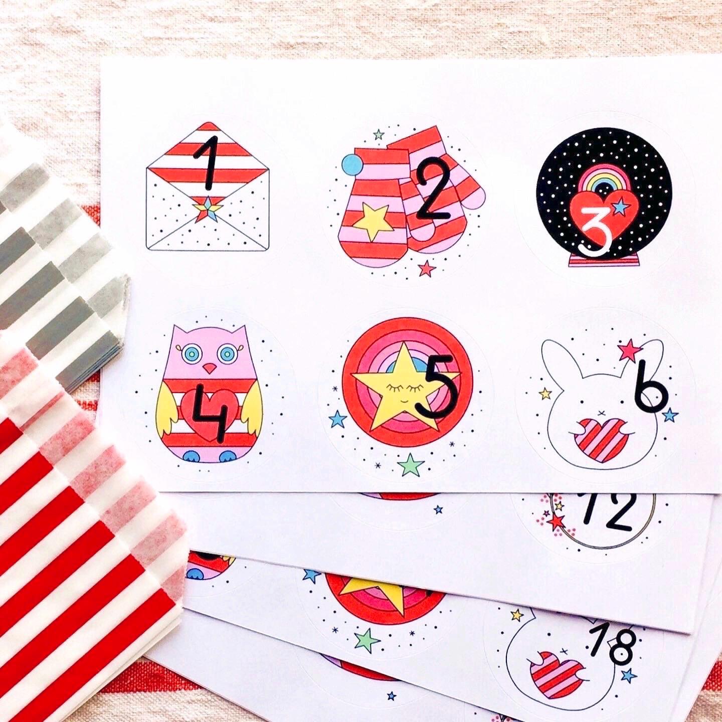 Make your own DIY advent calendar with 24 numbered stickers featuring cute and festive illustrations (2 stickers each of 12 designs). The stickers measure 6cm in diameter and are numbered from 1 to 24.